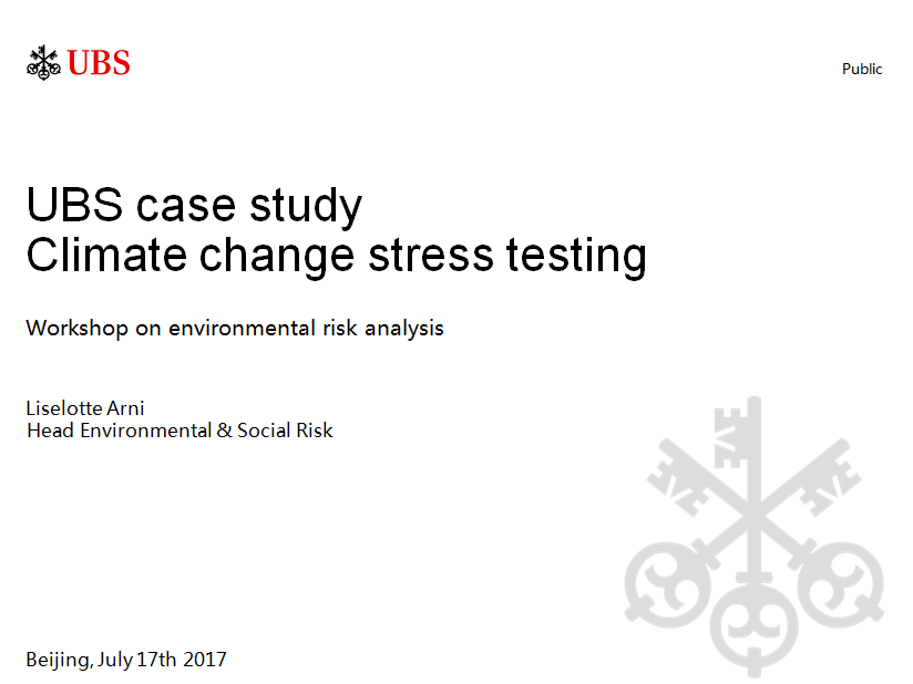 在第一单元:金融机构环境风险分析,对银行、保险公司、资产管理公司的环境风险量化方法和案例进行分享与讨论中,来自瑞银集团环境与社会风险部部门负责人Liselotte Arni做了“UBS case studyClimate change stress testing ”为主题的发言。点击图片下方下载相关附件。